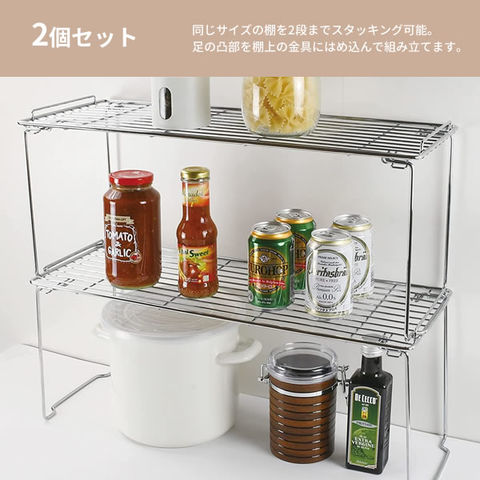 積み重ねて使用できます。 2つ使って2段棚にしたり、手前と奥に並べて広く使っても。
