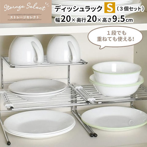 キッチン 収納 ストレージセレクト ディッシュラック S 3個セット 幅20×奥行20×高さ9.5cm HB-6073 | 皿 収納 幅20cm 食器 棚 整理 仕切り 3段 平置き ワイヤー 金属製 素朴