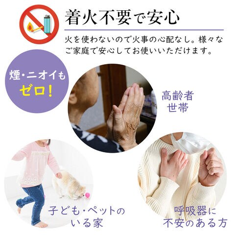 煙・ニオイが出ない火をつけないので煙やニオイの心配不要!呼吸器の敏感な方のいるご家庭でも安心してお使いいただけます。