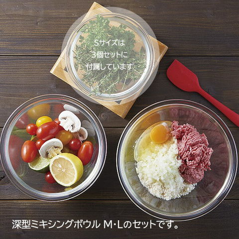深型で食材をこぼしにくい、耐熱ガラス製のボウルの2個セット。