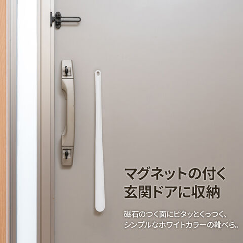 玄関ドアに磁石でピタッと貼り付き、収納場所を取らない靴べら。