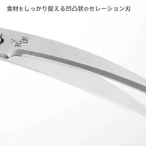 絶妙なカーブと凹凸形状の刃で食材が切りやすく、握りやすいハンドル形状のキッチンバサミ。