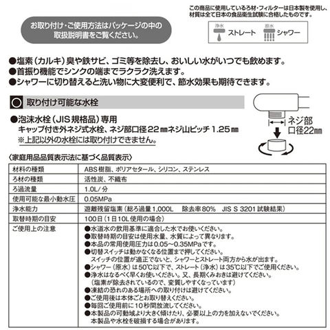 | 浄水能力(JIS S 3201試験結果) | (総ろ過水量1,000L 除去率80%) 遊離残留塩素/CAT(農薬)/2-MIB(カビ臭) |