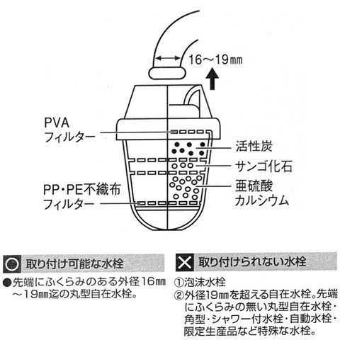 | 材質 | ジョイント/塩化ビニル樹脂 本体/スチロール樹脂 フィルター/PVA、PP、PE不識布 |