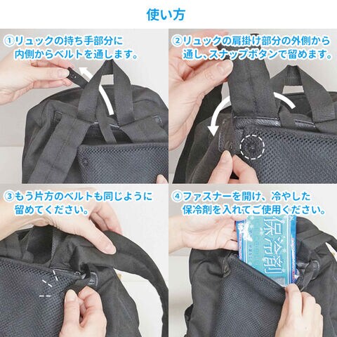 暑~い夏の通勤・通学など、外出時の背中の熱ごもりと汗を軽減するために役立つ、リュック装着型の保冷剤ケースと保冷剤のセット。