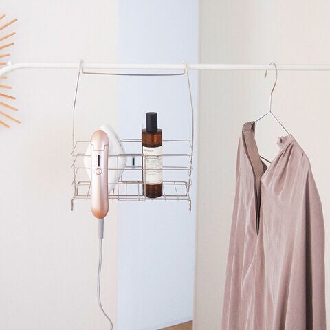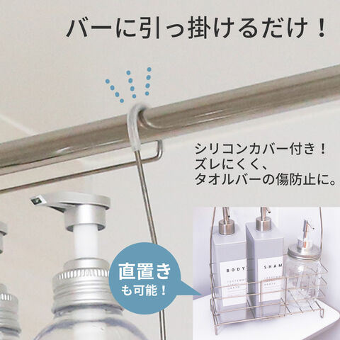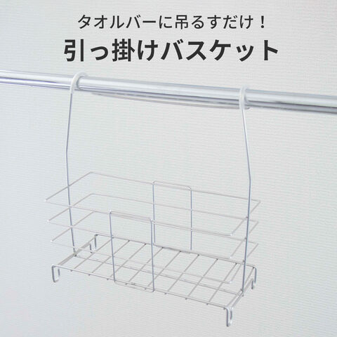 タオル掛けバーに吊るすだけで収納スペースがつくれるステンレス製バスケット。