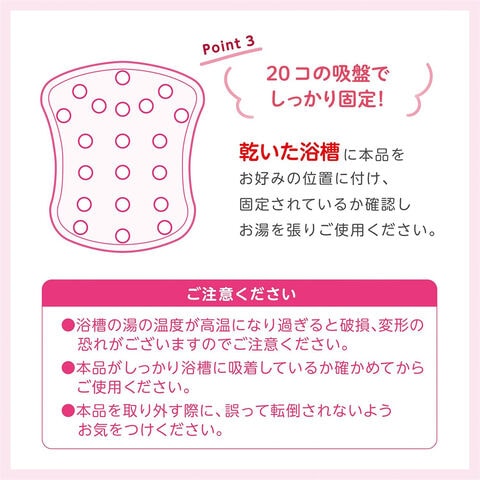 20個の吸盤で、浴槽にしっかり固定。※乾いた浴槽に貼ってからお湯をためてください。