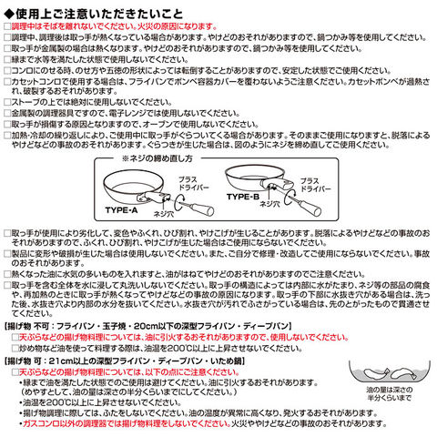 天ぷらなどの揚げ物料理については、油の量は深さの半分くらいまで・油温は200度以下で調理してください。また、ガスコンロ以外の調理器での揚げ物料理はしないでください。