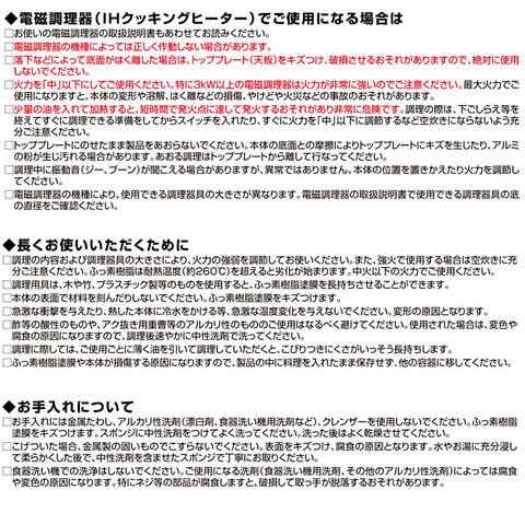 | 材質 | 本体/アルミニウム合金 底面/鉄・アルミニウム溶射 はり底 取っ手/フェノール樹脂 |