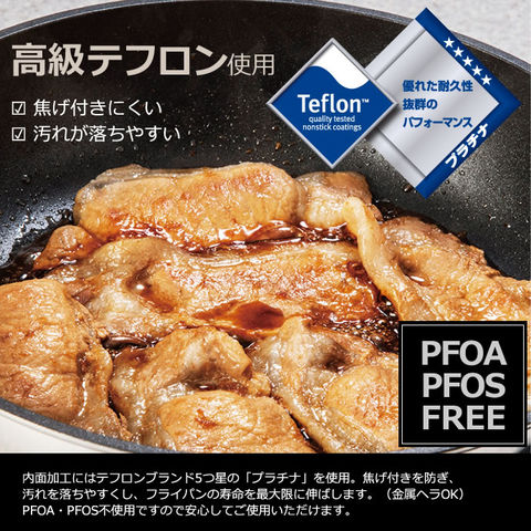 内面加工にはテフロンブランドのトップクラス「プラチナ」を使用。焦げ付きを防ぎ、汚れを落ちやすくし、フライパンの寿命を最大限に伸ばします。(金属ヘラOK)