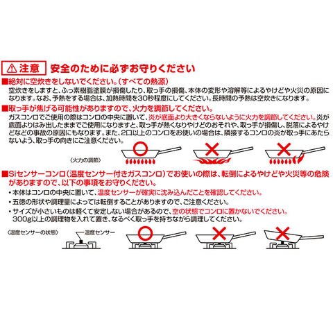絶対に空焚きをしないでください。空焚きをしますと、ふっ素樹脂塗膜が損傷したり、取っ手の損傷、本体の変形や溶解等による火傷や火災の原因になります。なお、余熱をする場合は、加熱時間を30秒程度にしてください。