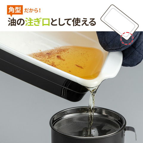 長い食材が揚げやすく、四角いから収納スペースをとらない、ホーロー製の角型天ぷら鍋。