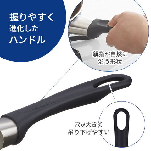 取っ手先端の引っ掛け穴が大きく、掛け収納もしやすくなっています。