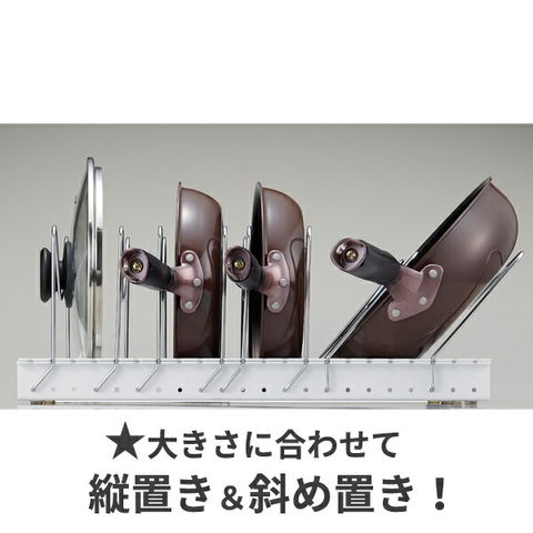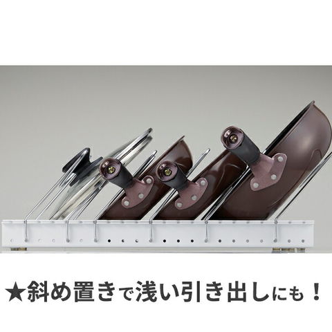 2wayタイプ縦置きとななめ置きの2wayタイプなので、浅い引き出しなど縦置きでは入らない大きいフライパンも収納できる!
