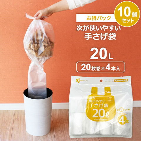 20枚分の手さげ袋が1本のロール状になった、便利な20Lサイズのポリ袋。4本がセットになったお得パックの10個セット。