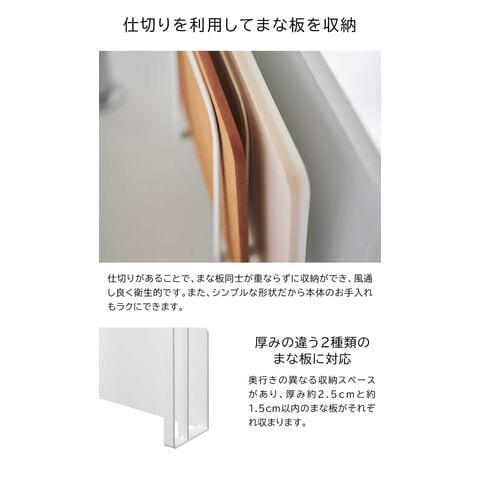 サイズ違いの仕切りがあり、厚み約2.5cm・約1.5cm以内のまな板を1枚ずつ収納することができます。
