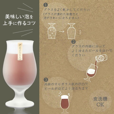 内面のすりガラス状の凹凸によって程よい泡が立ち、美味しいビールを愉しむことができます。