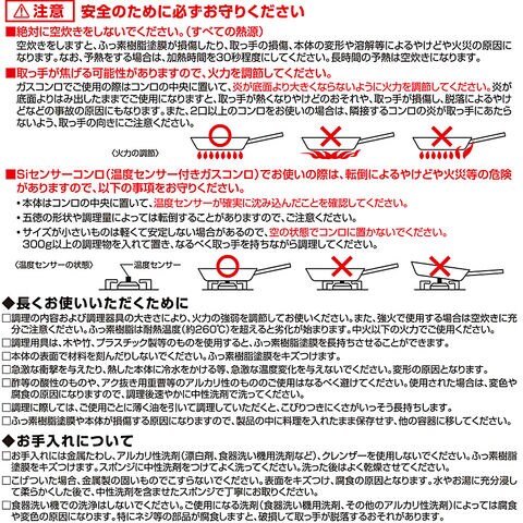 ご使用いただける熱源家庭用ガスコンロ・ラジエントヒーター・ハロゲンヒーター・エンクロヒーター・シーズヒーター ※火力を中火以下でご使用になるとフッ素樹脂塗膜が長持ちします。