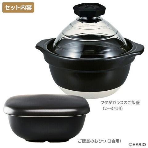 HARIO ハリオ 【2点セット】フタがガラスのご飯釜(2~3合用)と おひつ | 直火専用 炊飯鍋 2~3合用 炊飯 炊きあがりが見える 耐熱ガラスフタ 炊き上がりお知らせ 笛 おひつ 炊き立てご飯 陶器製 ごはん保存 米 水分調節 耐熱陶器 ごはん釜 火加減 調節要らず フタが転がらないのレビュー