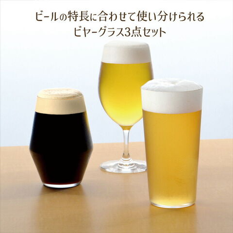 ビールの種類や気分に合わせて使い分けができる、形状の違うビールグラス3点セットです。