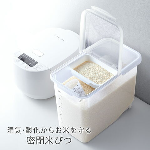 シリコーンゴムのパッキンとロック付きのフタがお米の鮮度を保つ密閉米びつ。