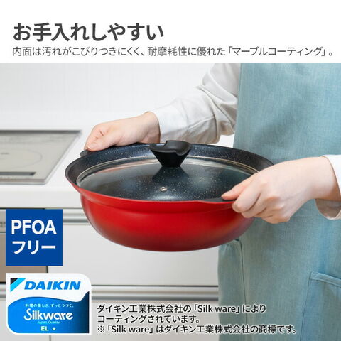 ダイキンの「Silkware」コーティングがされています。耐食性、非粘着性、耐熱性、耐磨耗性などに優れており、汚れや食材が付きにくいから調理後のお手入れも簡単です。