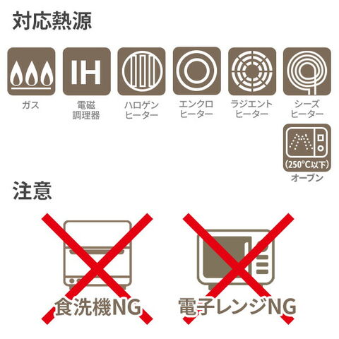 対応熱源ガスコンロ・IHクッキングヒーター・エンクロヒーター・ラジエントヒーター・ハロゲンヒーター・シーズヒーター・オーブン(※オーブンは250度以下)