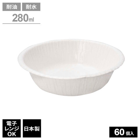 紙の使用量を抑えて環境に配慮した、耐水・耐油機能のある紙製のボウル(60個入)。デザートなどに最適な小さめサイズ。