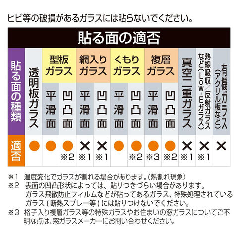 使用できないガラス網入りガラス、真空二重ガラス、熱線吸収ガラス、有機ガラス、アクリルガラス、断熱スプレーやガラス飛散防止フィルムなどの特殊処理されているガラス、などには使用できません。