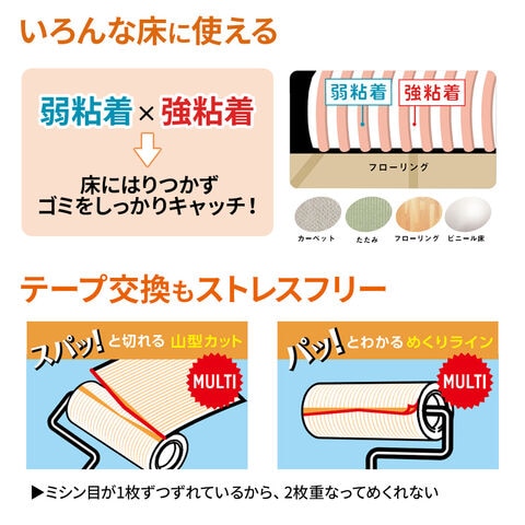 いろんな床に使える床にはりつかない弱粘着と、ゴミをしっかりキャッチする強粘着が交互に施されています。