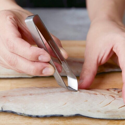 小骨が見つかりやすく、つかみやすいステンレス製骨抜きピンセット。