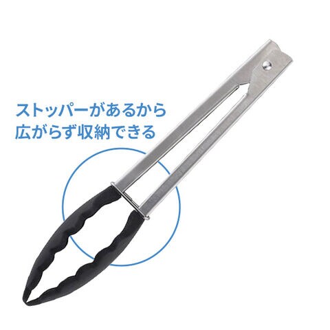 広がらず収納できるストッパー付きの、食材をつかみやすいシリコーン製トング。