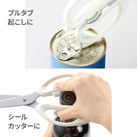 プルタブ起し、シールカッター、ドライバーの機能がついた、分解して洗えるキッチンばさみ。