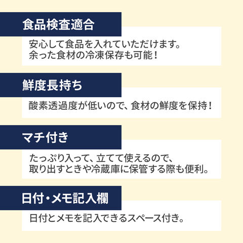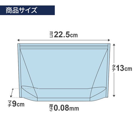 スペック1枚あたりサイズ(約):幅22.5×高さ(チャック部より下)13×底マチ9cm 厚み0.08mm