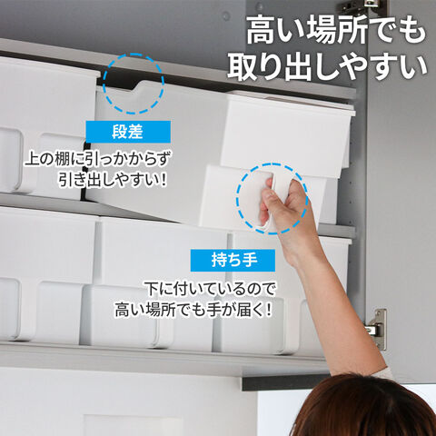 取り出しやすい!前面の持ち手が下についているので、高い場所でも引き出しやすくなっています。
