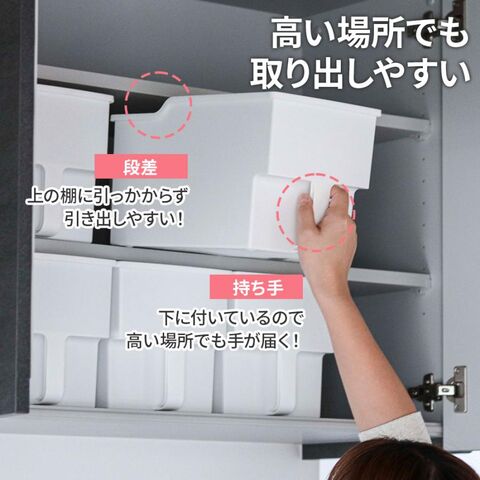 取り出しやすい!前面の持ち手が下についているので、高い場所でも引き出しやすくなっています。