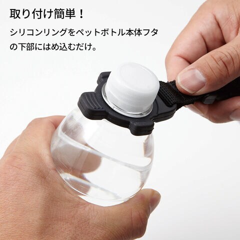 取り付け簡単ペットボトル本体フタの下部分にシリコンリングをはめ込むだけの簡単取り付けです。
