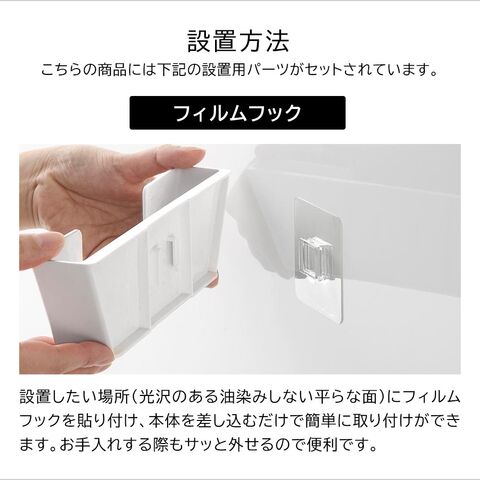 使用できる面 光沢のある平らな油染みしない面で、フィルムフックの接着面よりも大きい面 タイル・プラスチック・ステンレス・ガラス・金属塗装面・人工大理石