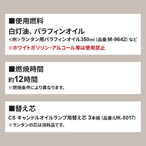 ランタンの芯は消耗品です。替え芯は、「CS キャンドルオイルランプ用替え芯 3本組(UK-5017)」を使用してください。