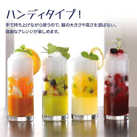手で持ち上げながら使うので、器の大きさや高さを選ばず自由なかき氷アレンジが楽しめます。