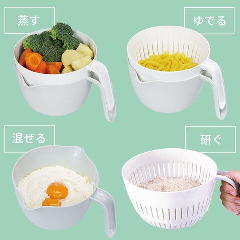 持ち手がついているので温めた後も持ちやすく、麺類の湯切りやお米研ぎにも便利です。