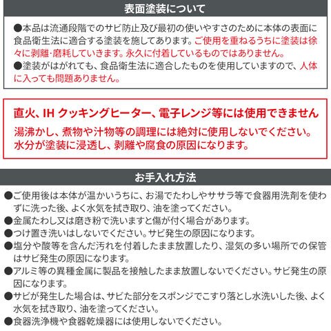 ご注意本製品は鉄製です。焦げ付き防止のため、調理前には薄く油をひいて下さい。