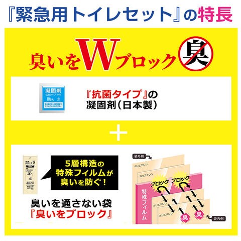 抗菌凝固剤+防臭袋で臭いをWブロック!災害時は、トイレの水が流せないだけでなく、ゴミの回収も滞ることがあります。長期間の汚物の保管には、臭い対策が必須です。