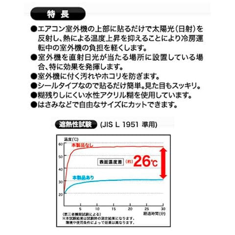 表面温度差26度本品を取り付けていない場合との室外機の表面温度差は約26度。優れた遮熱性を誇ります。