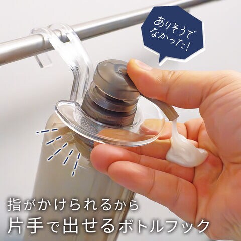 シャンプーなどのボトルをタオル掛けに吊り下げて、片手でポンピングできるボトルフック。
