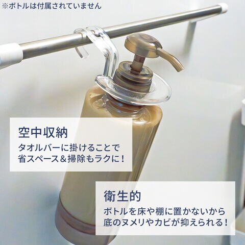 タオルバーに掛けて空中収納浴室の邪魔なボトルを浮かせて収納。省スペースで掃除もラクになります。