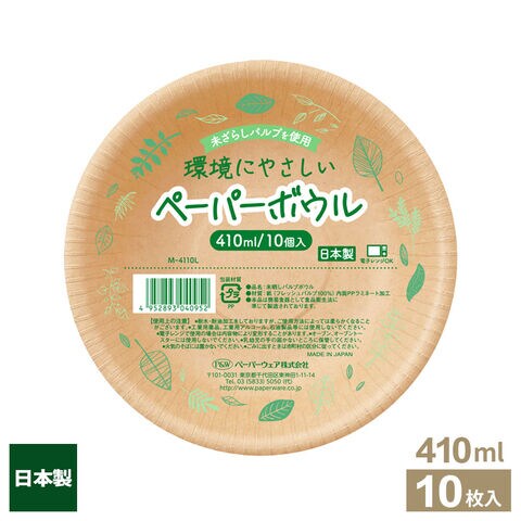 未晒しパルプボウル 410ml 10個入 M-4110L | 紙皿 使い捨て食器 ペーパーボウル 容器 日本製 深型 耐水 耐油 厚手 丈夫 電子レンジOK 汁もの スープ 丼 BBQ レジャー イベント パーティー