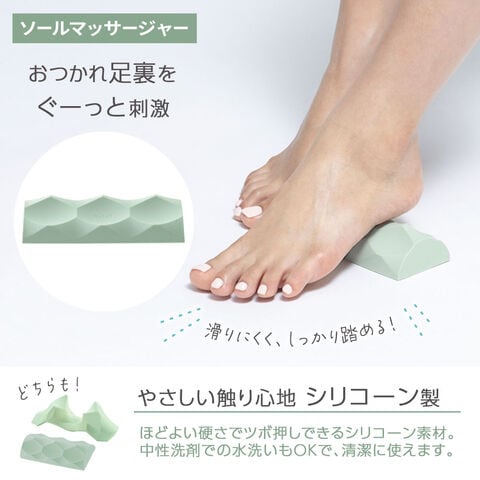 ソールマッサージャーについて踏むだけで足裏のツボをぐーっと押してくれる、青竹踏みのようなアイテム。優しい触り心地と程よい硬さのシリコーン素材が、足裏全体を程よく刺激します。