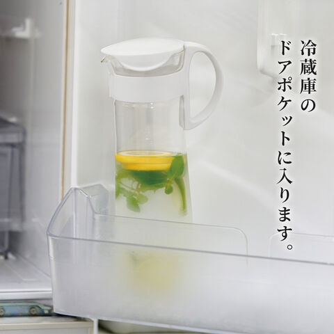 熱湯を入れても大丈夫、注ぐのに便利な取っ手が付いた耐熱ガラス製の冷蔵庫ポット。
