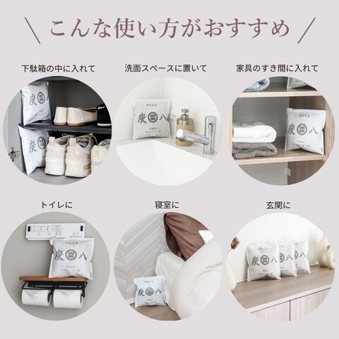 衣装ケースや棚の中など、コンパクトな形状を生かして狭い場所に使用できます。チップ状の炭を二重不織布で包んでいます。
